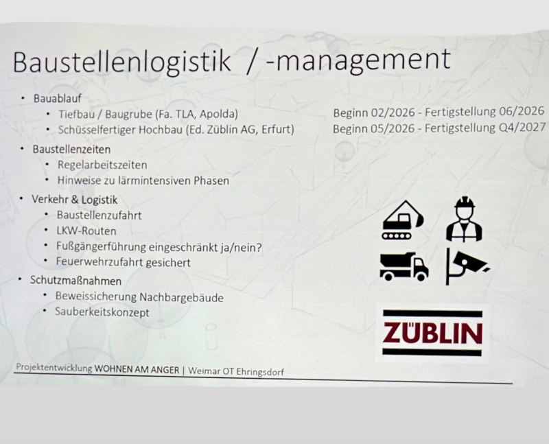 Am Montag, 23.2.2026, zur Bau-Sprechstunde ging es im Vereinshaus Zur Linde um die Baumaßnahme Wohnungsneubau am Ehringsdorfer Anger/ehem. Brauereigelände. Den zahlreich erschienenen Anwohnerinnen und Anwohnern herzlichen Dank für das Interesse am Projekt und die konstruktive Atmosphäre. Sehr viele Fragen konnten geklärt werden und wir erhielten Einblick in das Vorhaben, insbesondere, was den Ablauf auf der Baustelle betrifft und was genau entstehen wird. Nähere Informationen finden Sie auf der Website des Unternehmens Wohnen am Anger GmbH unter https://www.mkprojectcontrol.com/projekte/wohnen-am-anger-weimar
