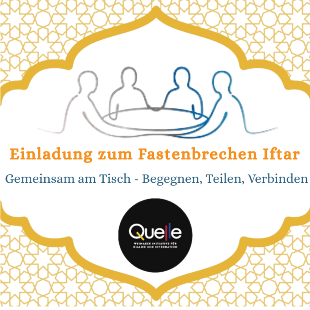 Nach vielen herzlichen Begegnungen zum Kuchenbazaar im Januar lädt die Weimarer Initiative für Dialog und Integration Quelle wieder zum traditionellen Fastenbrechen-Iftar-Essen ein, um bereichernde Momente in der Zeit des Ramadans miteinander zu erleben und gemeinsam köstliche Speisen zu genießen. Die interkulturelle Zusammenkunft findet am 7. März von 17.40-20.40 Uhr im Vereinshaus Zur Linde, Weimarische Straße 1, statt. Auch der Ortsteilrat freut sich auf viele Gäste aus dem Ortsteil. Wir erbitten eine Anmeldung bis 04.03. an quelleweimar@gmail.com